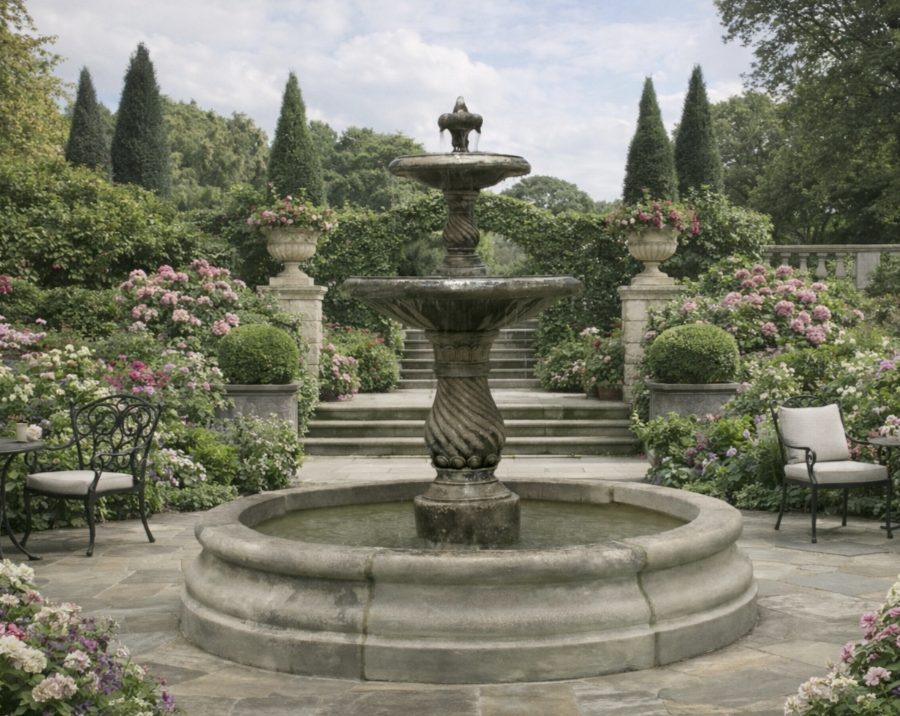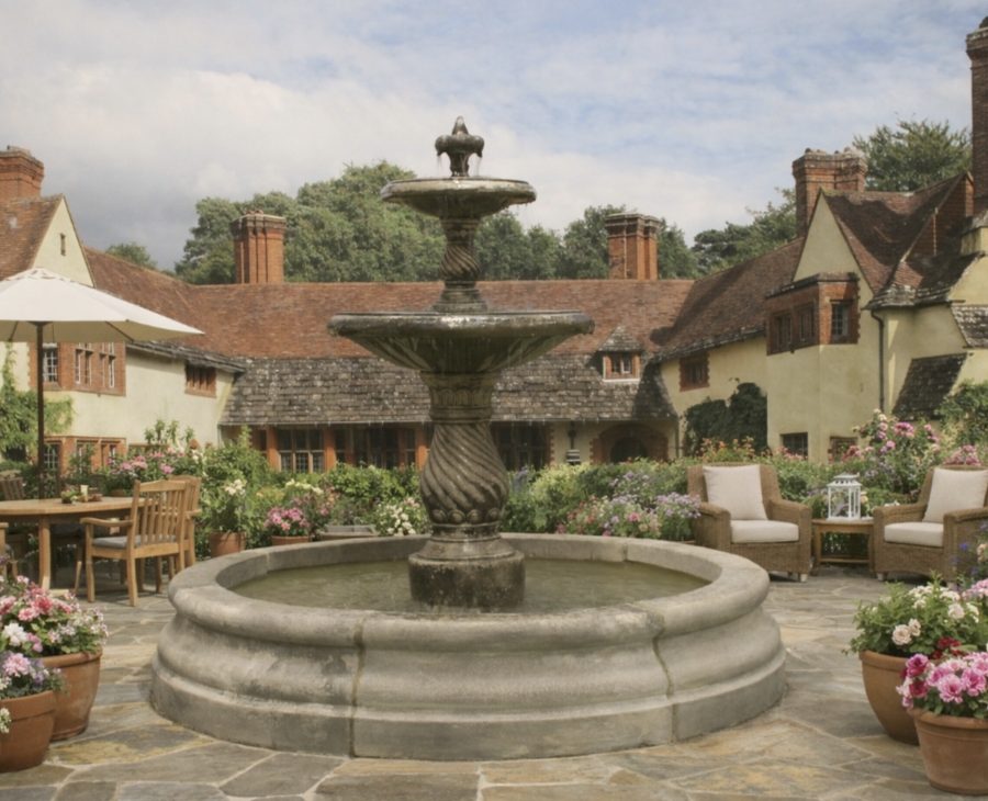2 Tiered Candy Twist Fountain with Small Romford Pool Surround. Beautiful small Romford pool surround complemented with a modern 2 tiered Candy Twist fountain.