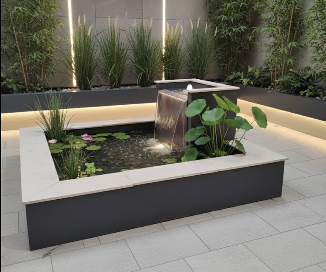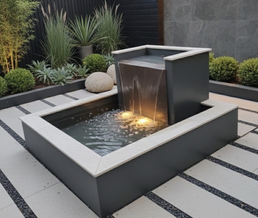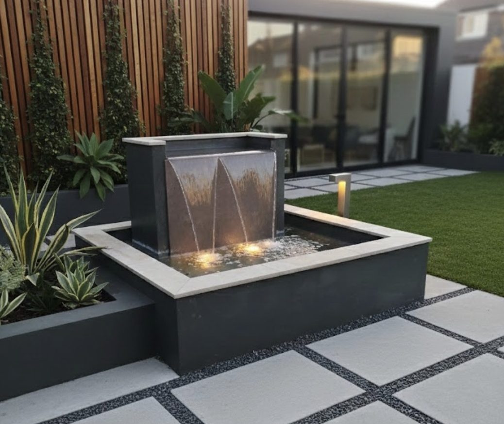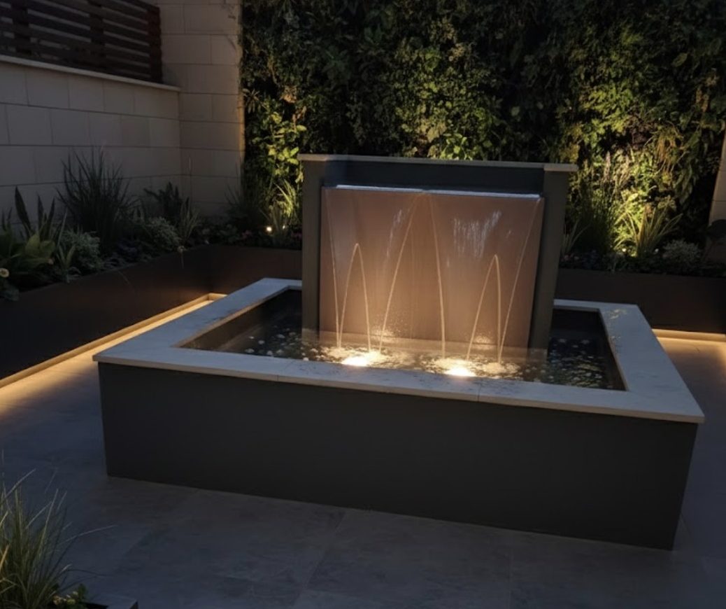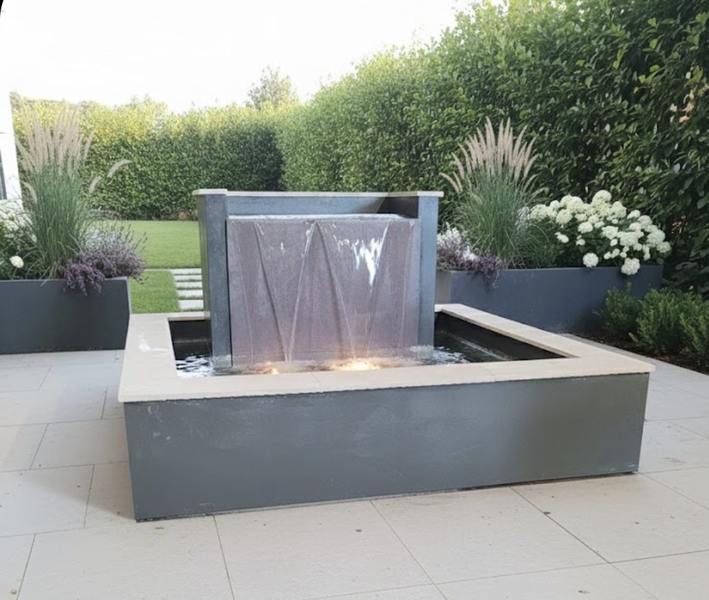 Just fountains is please to offer our new design square Hayward waterfall fountain , a striking focal point that combines the soothing sound of moving water, and as an optional add on of lighting, making it suitable for evening use and modern landscape designs.