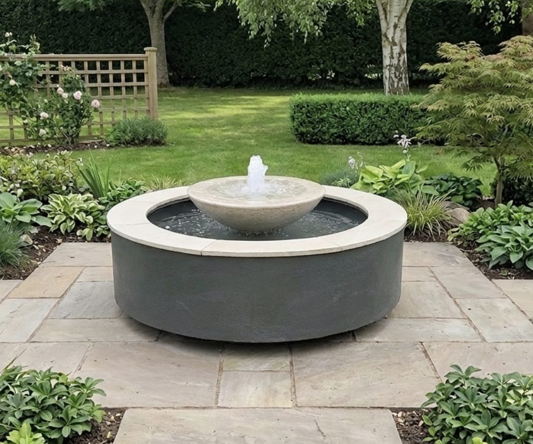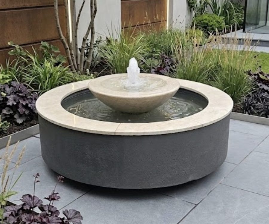 Pictured in our Battle ship grey colour,  complimented with Quartz white edging tiles, and a white limestone bowl fountain